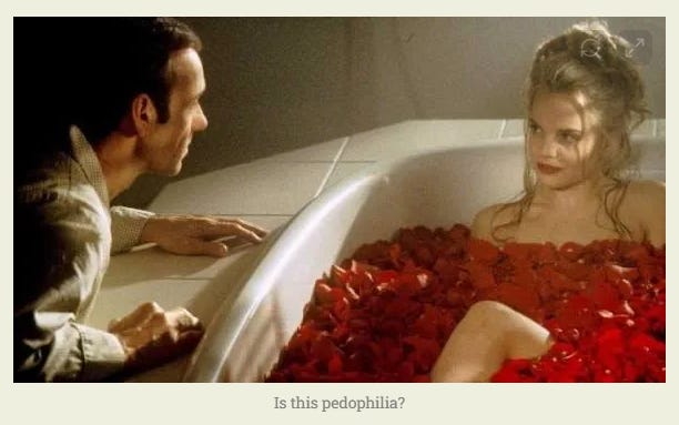 Then we have the image from the film American Beauty that Hanania chose himself to illustrate…what? American Beauty (1999) is literally the modern cinematic companion piece to Lolita. The whole point of the movie is that Lester is a creepy, self-deluding predator whose “attraction to youth” is not noble or biologically pure; it is a symptom of his midlife crisis and moral rot.